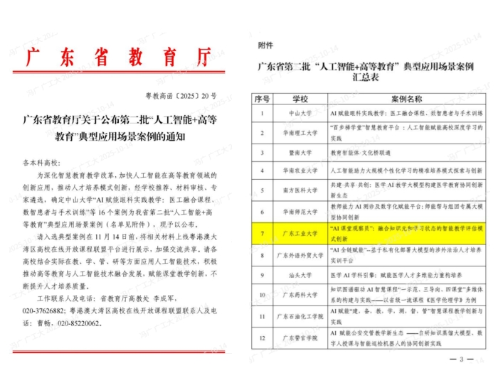 近日,广东省教育厅公布了第二批“人工智能+高等教育”典型应用场景案例名单,由广工牵头申报的《“AI课堂观察员”:融合知识元和学习状态的智能教学评估模式创新》成功入选,标志着学校在智慧教学与评价创新方面走在全省前列。