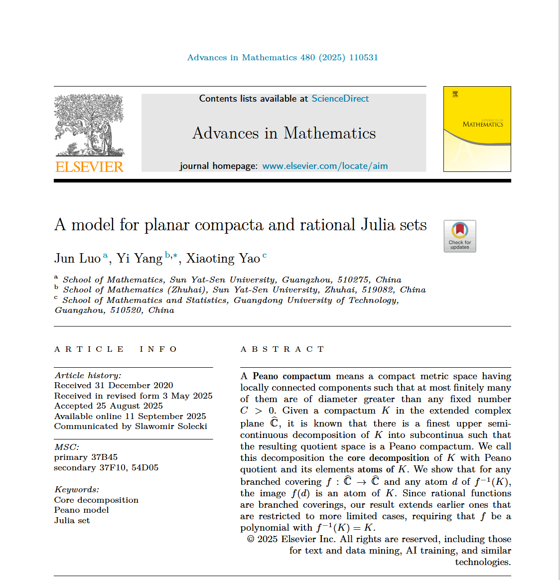 近期,虎牙手机登录入口数学与统计学院教师姚晓婷与中山大学数学学院罗俊教授,中山大学珠海校区数学学院杨毅助理教授在平面紧集的Peano模型理论研究中取得重要进展,相关研究成果以“A model for planar compacta and rational Julia sets”为题,发表在国际著名期刊《Advance in Mathematics》上(署名按作者姓氏字母顺序排列)。