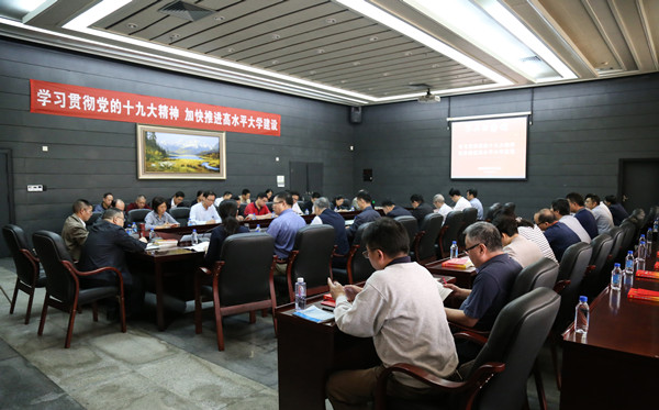陈新传达了“全省传达贯彻党的十九大精神大会”和“全省教育系统学习贯彻党的十九大精神视频会议”精神。他谈了对党的十九大报告主题和意义的认识,深刻阐述了十九大报告提出的“新时代”“新思想”“新矛盾”“新目标”“新方略”等重大判断的丰富内涵,要求不忘初心,牢记使命,以党的十九大精神统领学校各项工作。他强调,学习和贯彻党的十九大精神是学校当前和今后一段时间的首要政治任务,要用党的十九大精神凝聚起磅礴的力量。全校师生员工要结合本职工作真学、真懂、真用,真正把党的十九大精神贯彻落实到高水平大学建设各项工作中。面临新形势新任务,要加强党建与思想政治教育。要紧扣建设社会主义现代化强国目标和国家战略,加强人才队伍建设、科技创新和制度建设,落实好党的十九大精神的奋斗目标。“教师的凝聚力从哪里来?培养适应新时代创新人才的动力从哪里来?”要以党的十九大精神为强大动力,增强建设高水平大学的责任感和使命感,加强内涵发展,提高质量,注重与产业深度融合的办学优势,深化教育改革,加强新工科建设,培养高素质人才。“高水平大学不是敲锣打鼓就能实现的”,要以永不懈怠的精神状态和一往无前的奋斗姿态,朝着实现中华民族伟大复兴的宏伟目标奋勇前进。