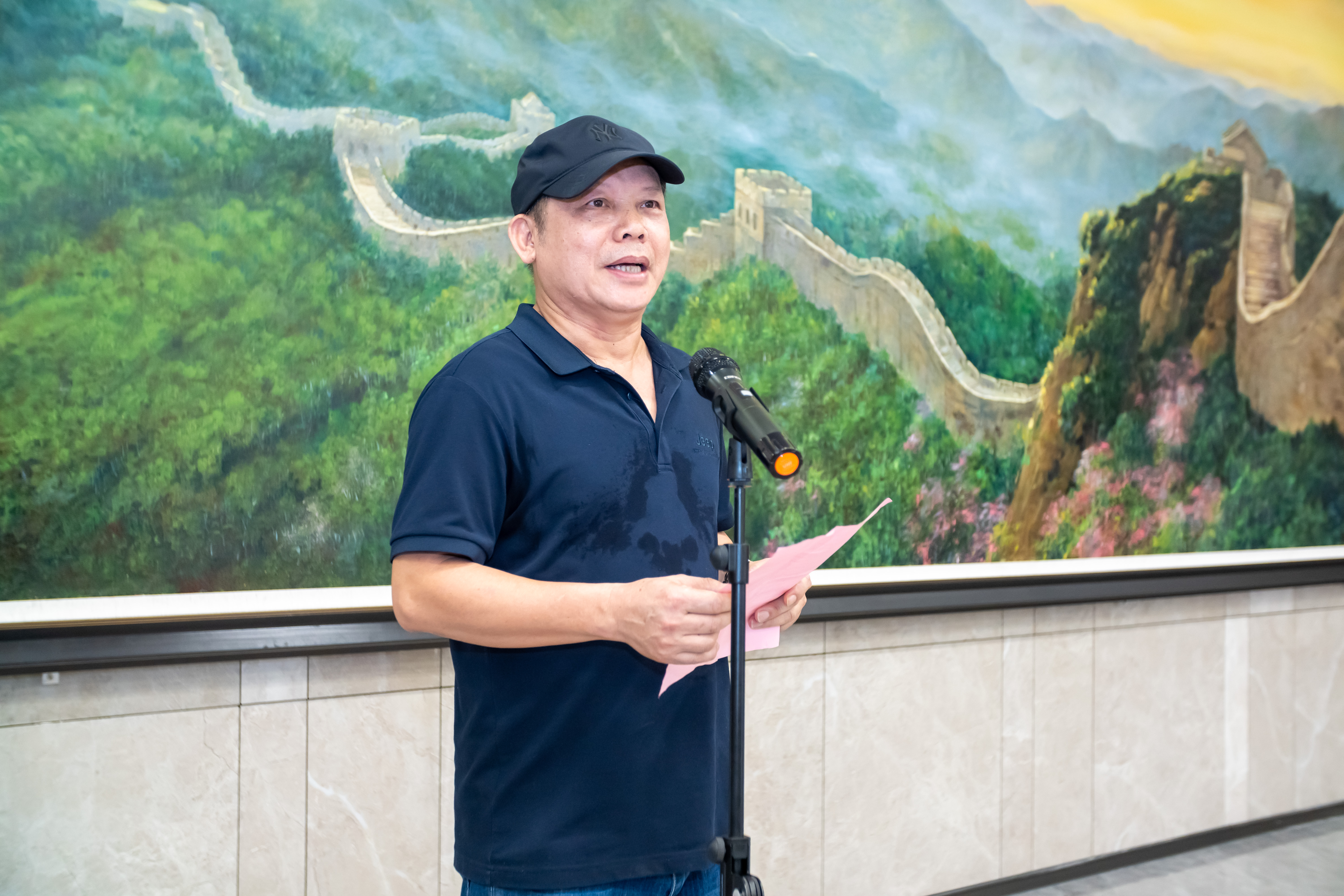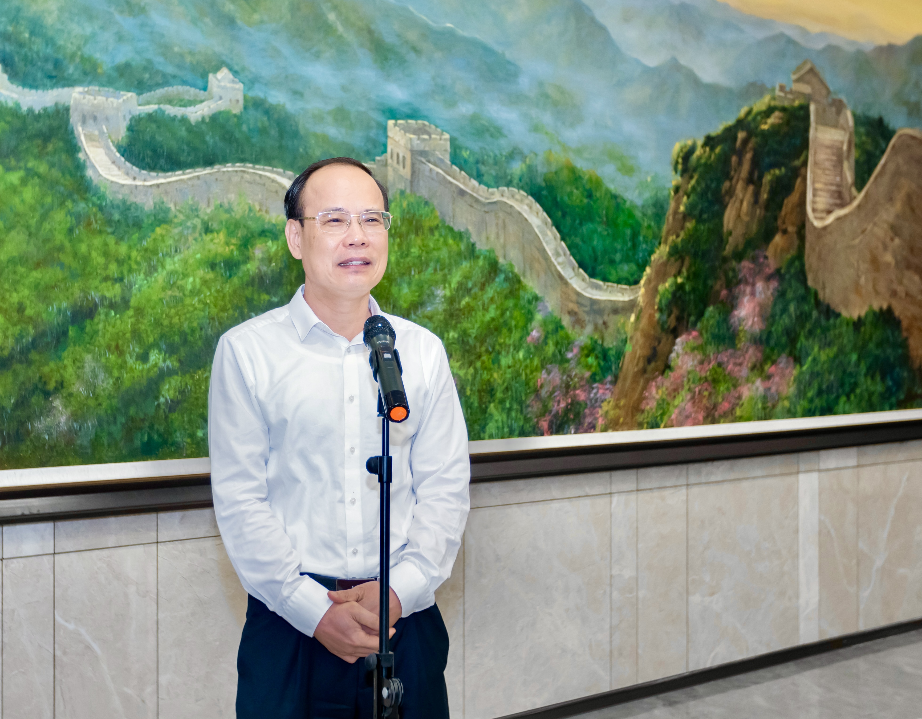 为表彰油画创作团队的无私奉献和辛勤付出,邱学青向捐赠学校大型油画作品的创作团队成员颁发了捐赠证书。作品主创人、艺术与设计学院美术系教授、广州市美术家协会副主席张洪亮,介绍了创作历程以及作品采用的独特技法与万里长城、旭日东升等意象元素,由技入道、借物寓意,作品饱含了对国家繁荣富强、人民幸福安康、学校事业蓬勃发展的美好期许。