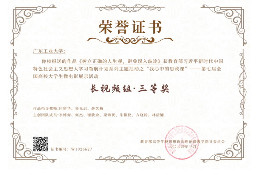 近日,“我心中的思政课”第八届全国高校大学生微电影展示活动评选结果揭晓,广工学生团队作品《树立正确的人生观,避免误入歧途》获得长视频组全国三等奖。