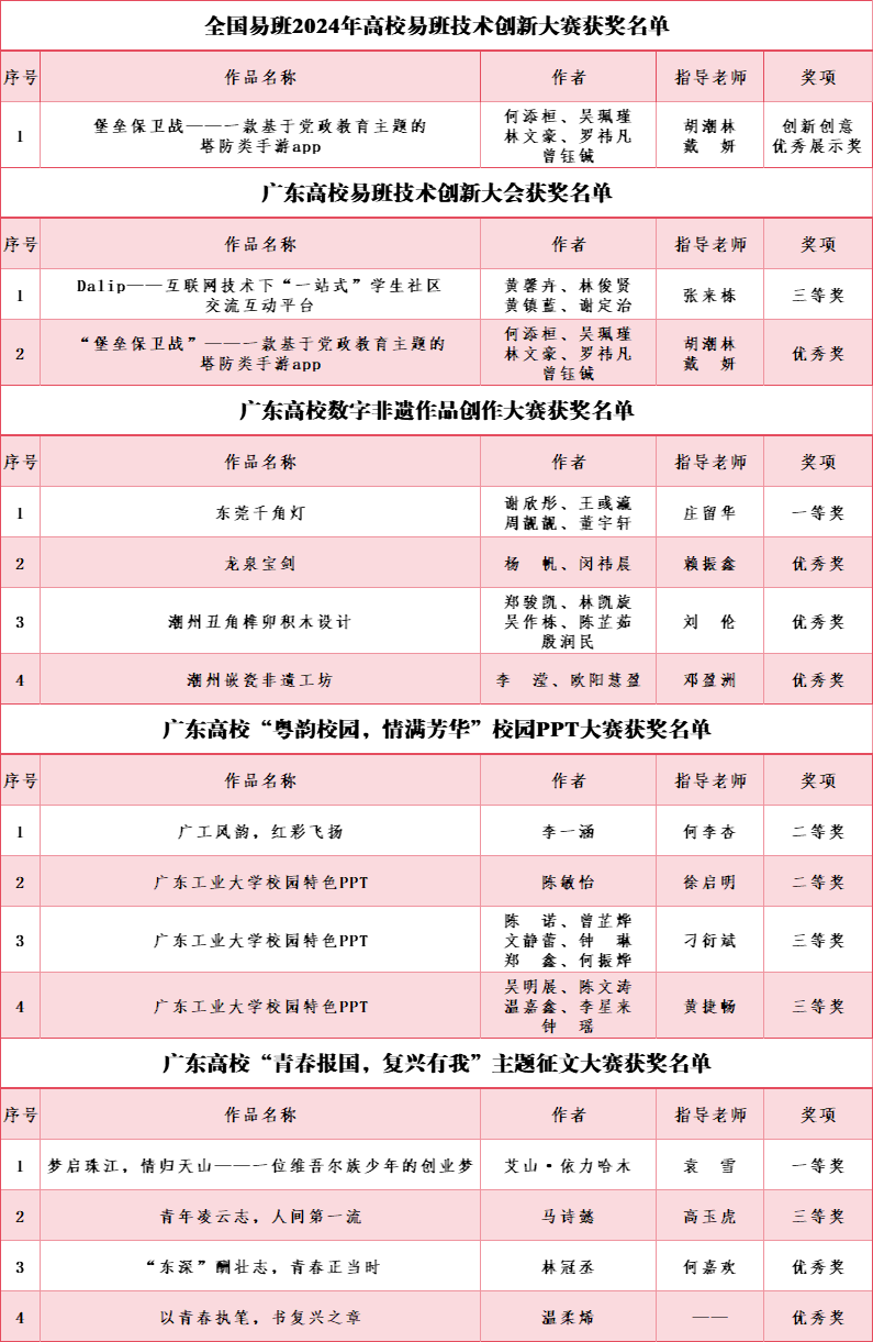 近日,由广东高校网络思想政治工作中心、广东高校易班发展中心组织开展的多项省级网络主题教育活动公布获奖结果,广工共有15项学生作品获奖,其中一等奖2项、二等奖2项、三等奖4项,优秀奖7项,获奖成绩在全省高校中名列前茅。